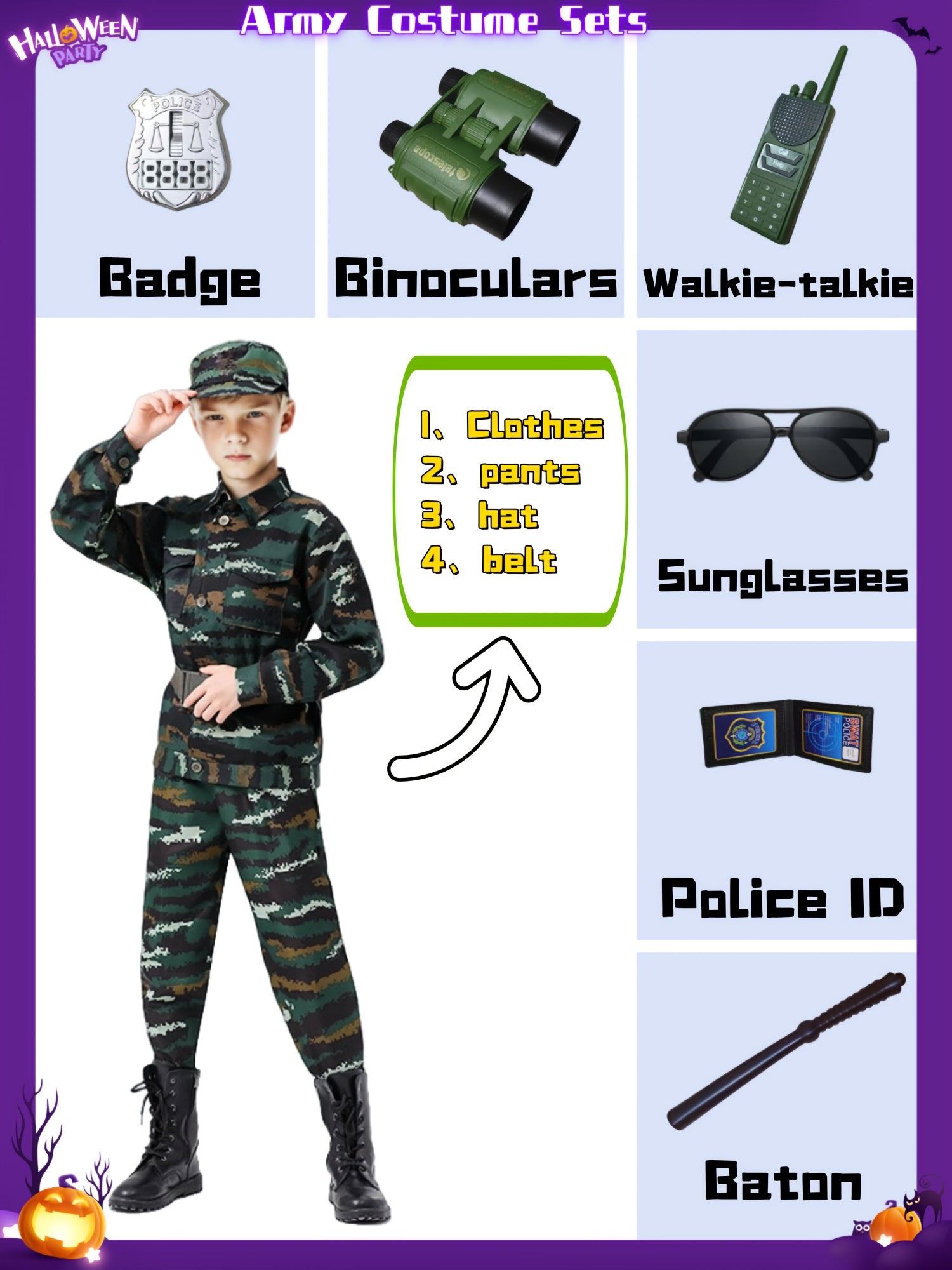 Ready for role-play missions and Halloween fun. This all-season set features a camo uniform (lapel collar, long sleeves, button details) with matching trousers, plus play accessories to complete the look. Light-stretch polyester keeps it comfy for parties, school events, and dress-up at home.